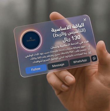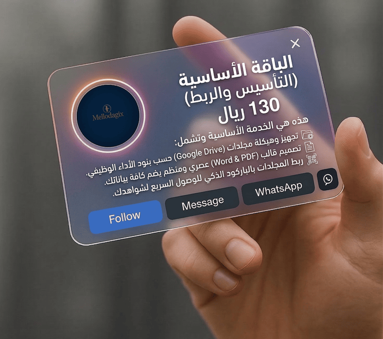 الباقة الأساسية (التأسيس والربط) | 130 ريال هذه هي الخدمة الأساسية وتشمل: تجهيز وهيكلة مجلدات (Google Drive) حسب بنود الأداء الوظيفي تصميم قالب (Word & PDF) عصري ومنظم يضم كافة بياناتك ربط المجلدات بالباركود الذكي للوصول السريع لشواهدك